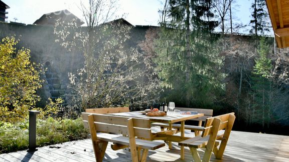 Grande terrasse au bord du ruisseau, idéale pour savourer un café au soleil ou partager un apéritif convivial.