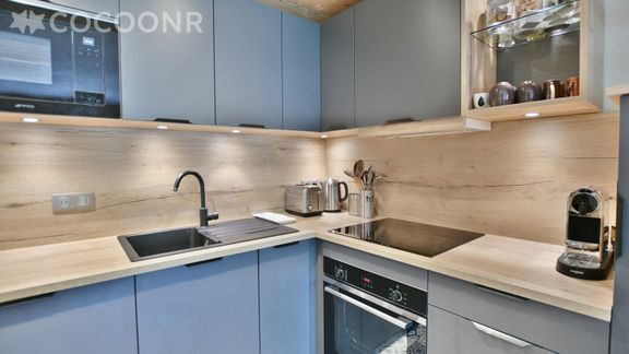 - Une cuisine ouverte entièrement équipée avec lave-vaisselle, four, plaques vitrocéramiques, machine à café filtre, hotte et un frigo