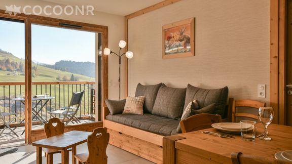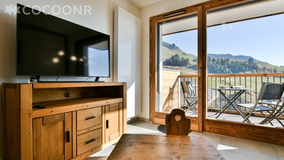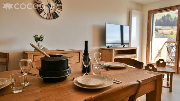 - Un balcon aménagé avec table et chaises, idéal pour profiter des beaux jours et de la vue sur la montagne.