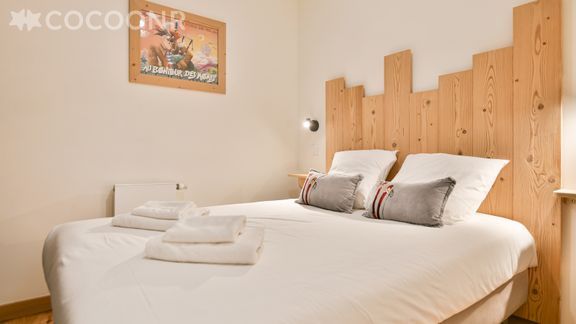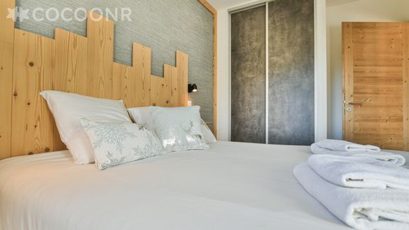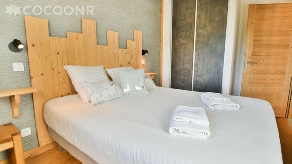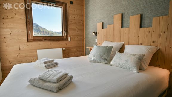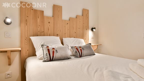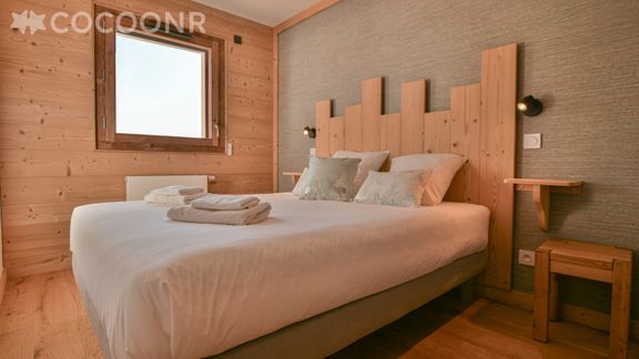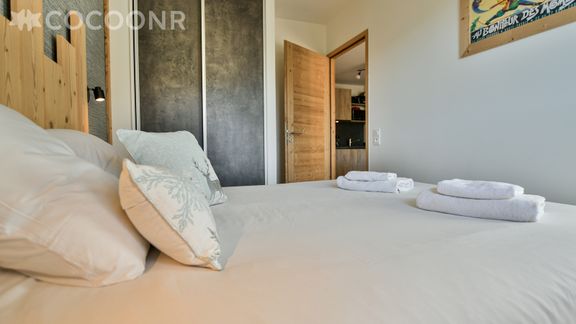 - Chambre 1 : lit queen-size (160×200). La pièce bénéficie d'une fenêtre offrant une vue sur la montagne.
