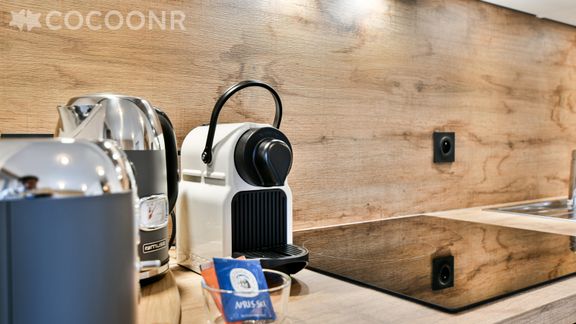 - Une cuisine équipée avec notamment : bouilloire électrique, four, cafetière, grille-pain, lave-vaisselle, plaques de cuisson...