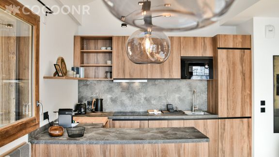 - Une cuisine ouverte équipée avec notamment : four, lave-vaisselle, plaque induction, micro-onde, grille-pain, bouilloire, machine à café Nespresso