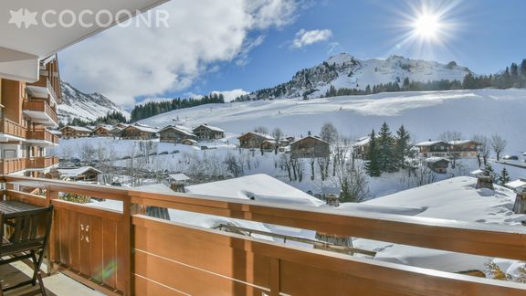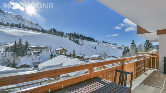 - Un balcon exposé sud offre une vue magnifique sur les pistes, avec table et chaises de jardin.