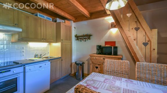 - Une cuisine équipée comprenant une plaque vitrocéramique, un lave-vaisselle, et de la vaisselle, est ouverte sur la salle à manger.