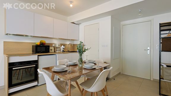 - Une cuisine ouverte équipée avec notamment : bouilloire électrique, four, four à micro-ondes, grille-pain, plaques de cuisson, machine à café Krups...