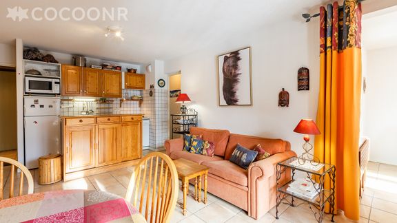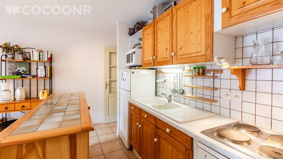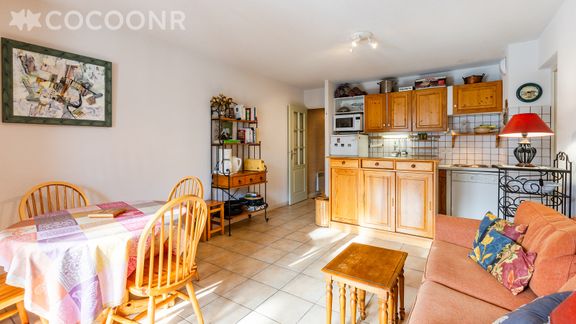 - Une pièce de vie, avec un canapé, un coin repas ouvert sur une kitchenette équipée avec notamment : bouilloire électrique, four, four à micro-ondes, grille-pain, lave-vaisselle, plaques de cuisson...