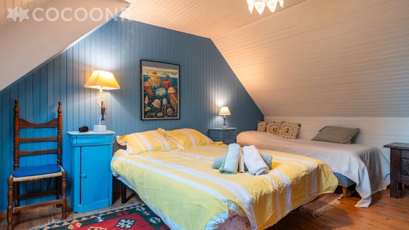 - Chambre 1 : un lit double (140×200) et un lit simple (90×190) avec lit parapluie, armoire, TV, commode, table de chevet et radio réveil.