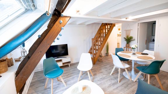 Duplex mansardé dans centre de Palais, idéalement situé proche des commodités, bars et restos , aménagé avec soin, literie confortable, arrivée autonome sans problème, communication fluide avec l’agence . Nous avons passé un excellent séjour