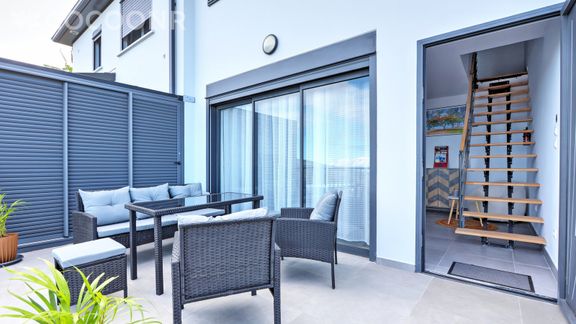 - Une terrasse avant privée de 15 m² avec salon de jardin et coffre extérieur