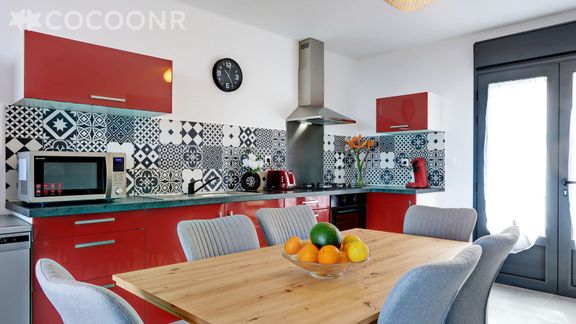 - Une cuisine équipée avec notamment : bouilloire électrique, four, four à micro-ondes, grille-pain, senséo et cafetière, lave-vaisselle, réfrigérateur et congélateur, plaques de cuisson...