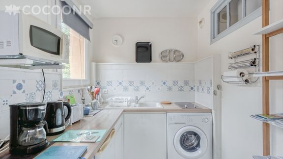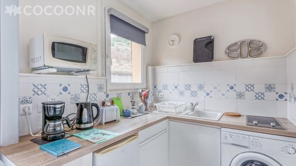 - Une cuisine fermée et entièrement équipée : réfrigérateur, congélateur, plaques à induction, lave-linge, micro-ondes, grille-pain, bouilloire, cafetière à filtres...