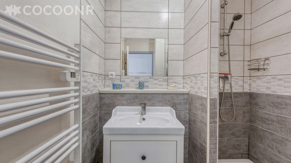 - Une salle d'eau avec une douche, une vasque, du gel douche et/ou du shampoing, des rangements et un sèche-serviettes chauffant.
