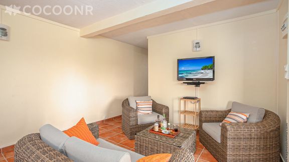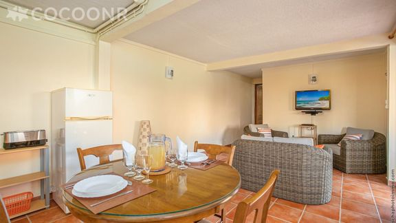 - Une pièce de vie de 30 m² avec TV (connexion canal +), canapé, fauteuils et espace repas.