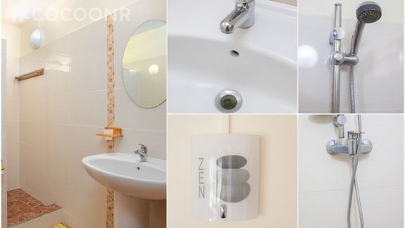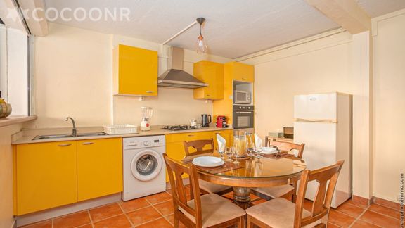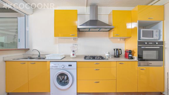- Une cuisine ouverte équipée avec notamment : bouilloire électrique, four, four à micro-ondes, grille-pain, cafetière à dosettes Nespresso, mixeur, lave-linge...