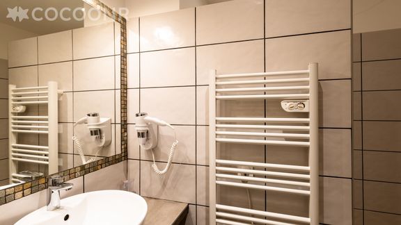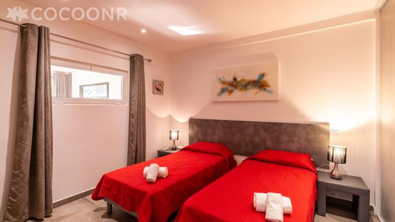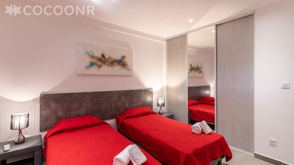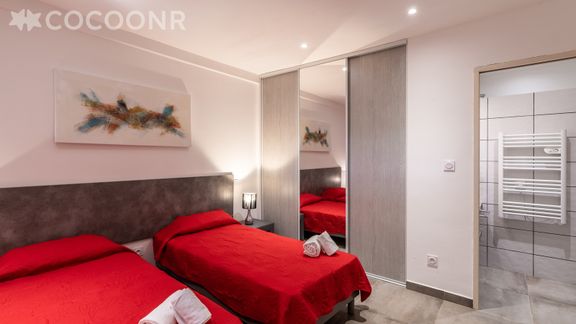 - Deux chambres, chacune dotée de deux lits simples (pouvant être rapprochés pour créer un lit double) et d'une salle d'eau attenante avec une douche, une vasque, un sèche-serviette chauffant, un sèche-cheveux et un WC.