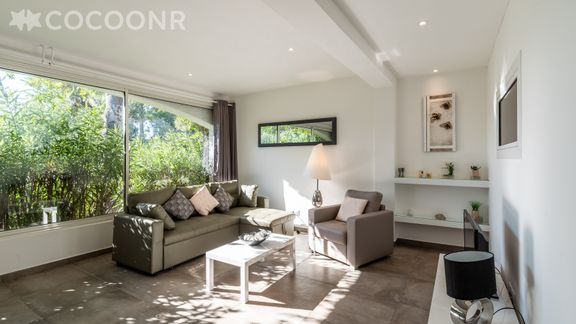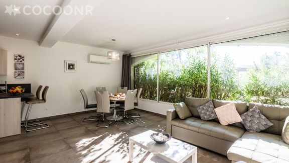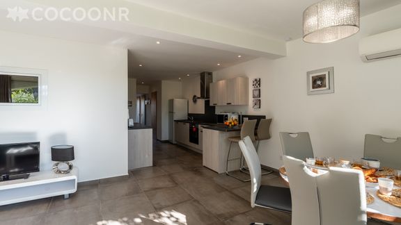 - Une belle pièce de vie très lumineuse avec un coin salon doté d'un canapé-lit double, un fauteuil, une table basse, d'une TV ainsi qu'un espace repas avec une table à manger conviviale pouvant accueillir jusqu'à 6 personnes.