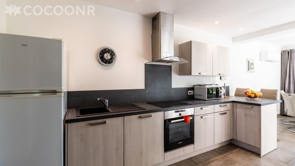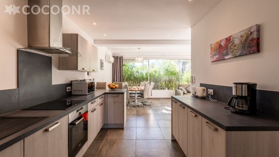 - Une cuisine ouverte sur la pièce de vie et entièrement équipée : réfrigérateur, lave-vaisselle, four, plaques à induction, micro-ondes, grille-pain, bouilloire, cafetière Tassimo et à filtre..