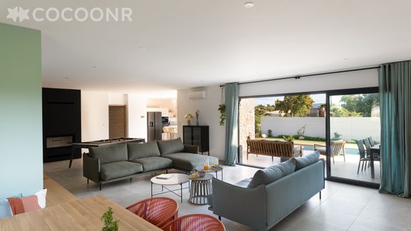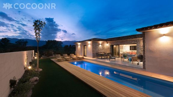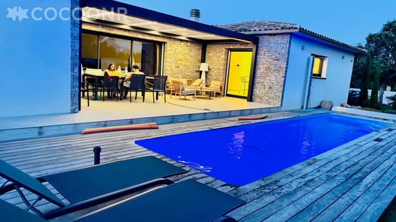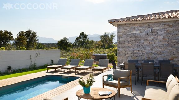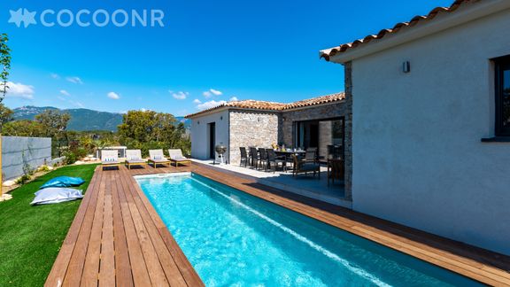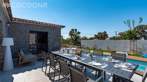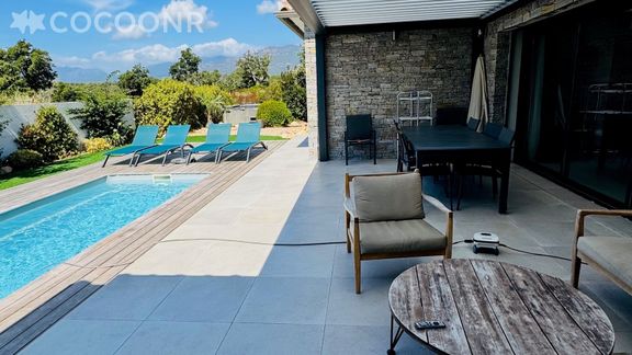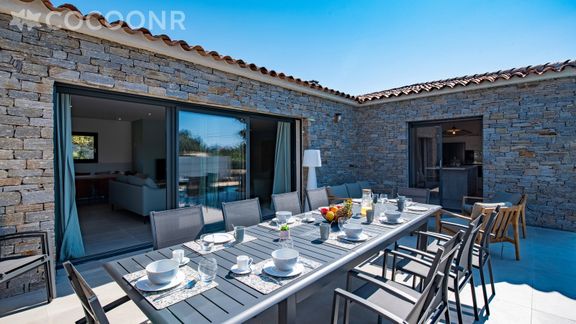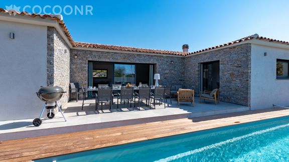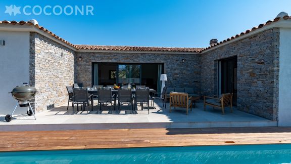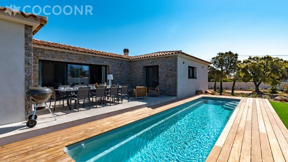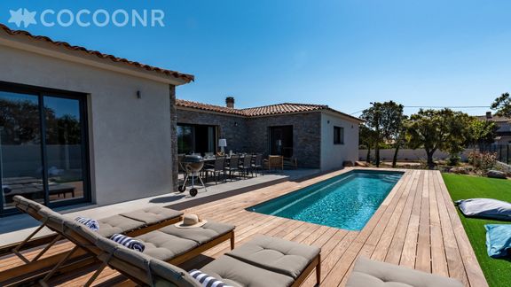 Nous vous proposons à la location, sur la commune de Lecci, en Corse sur l'île de beauté, cette charmante villa climatisée avec piscine et jacuzzi, d’une superficie de 200 m² et pouvant accueillir jusqu’à 10 voyageurs. Elle est composée d’une jolie pièce à vivre de 80 m² (avec cheminée), d'une cuisine ouverte équipée, de cinq belles chambres, quatre salles de bain et vous pourrez profiter d’un jardin d’environ 1 000 m². Wifi, draps et serviettes inclus, nous n’attendons plus que vous !