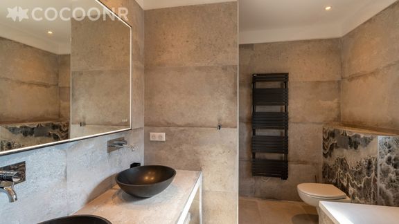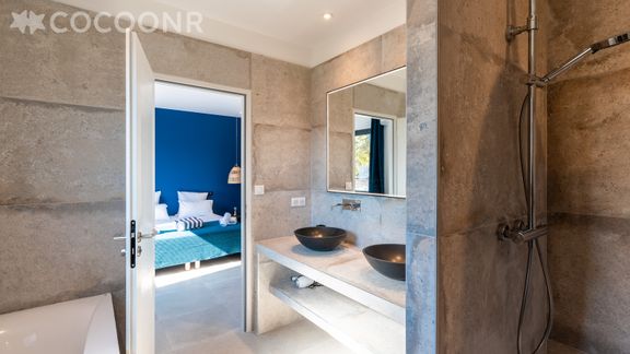 - Chambre 1 : un lit queen-size (160×200), une salle de bain attenante avec douche, baignoire, double vasque et WC.
