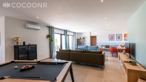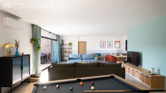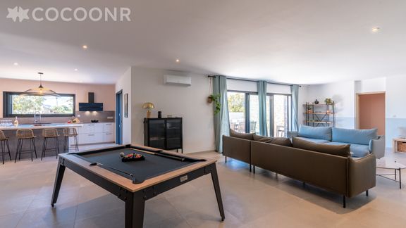 - Une pièce de vie de 80 m² avec TV, cheminée avec insert à galandage, canapés, espace repas et billard.