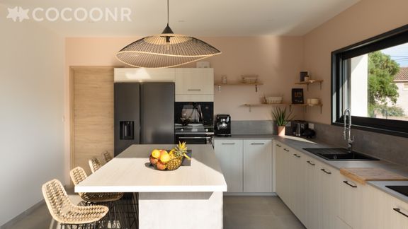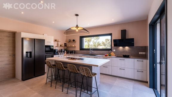 - Une cuisine ouverte équipée avec notamment : îlot central, bouilloire électrique, four, four à micro-ondes, grille-pain, lave-vaisselle, plaques de cuisson, machine à café avec broyeur intégré...
