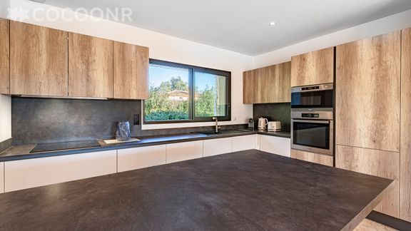 - Une cuisine ouverte équipée avec notamment : bouilloire électrique, four, four à micro-ondes, grille-pain, lave-vaisselle, réfrigérateur, plaques de cuisson, ...