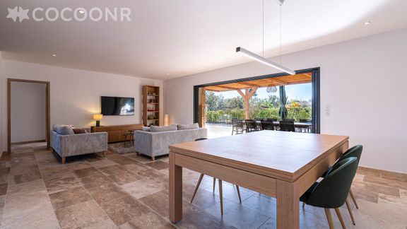 - Une pièce de vie de 54 m² avec TV, canapés (dont un convertible en lit double) et un espace repas avec une table convertible en billard René Pierre (réservé aux adultes et aux adolescents de 15 ans et plus, interdite aux moins de 15 ans).