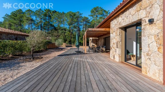- Pergola en bois et terrasse bois exotique (IPE) d'une surface d'environ 146 m², exposée Sud avec mobilier pour profiter des beaux jours