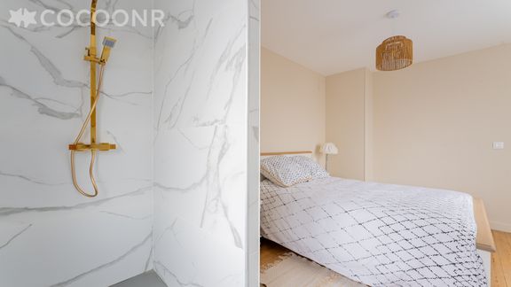- Une chambre avec un lit double (140×190) et une salle d'eau attenante avec douche