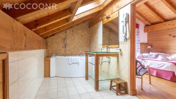 - Chambre avec charpente apparente : 2 lits simples et salle de bain (baignoire balnéo et wc)