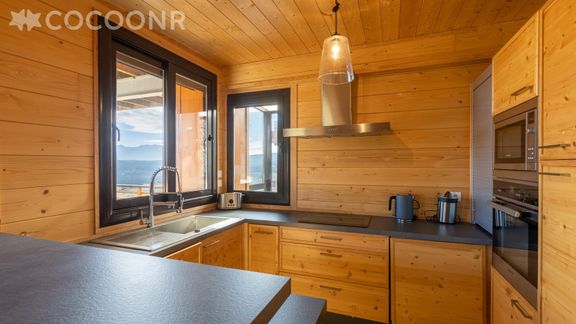 - Une cuisine ouverte équipée avec notamment : bouilloire électrique, four, four à micro-ondes, grille-pain, lave-vaisselle, plaques de cuisson, cafetière à dosettes Nespresso...