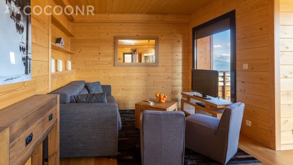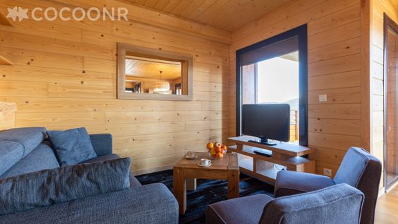 - Une pièce de vie de 28 m² avec TV, canapé-lit, fauteuils et espace repas.