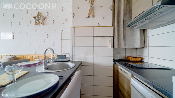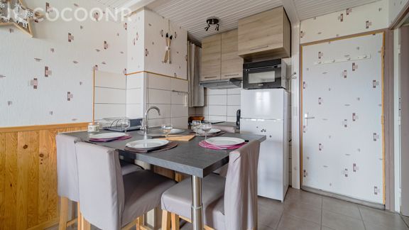 - Une cuisine ouverte équipée avec un coin repas pour 4 personnes et avec notamment : bouilloire électrique, grille-pain, four à micro-ondes, four, appareil à raclette, 2 plaques de cuisson vitro, lave-vaisselle...