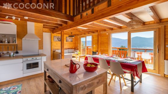 Beau chalet traditionnel de montagne avec une très belle vue sur le lac et les montagnes.