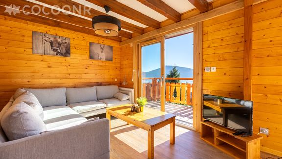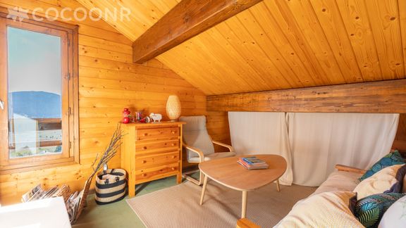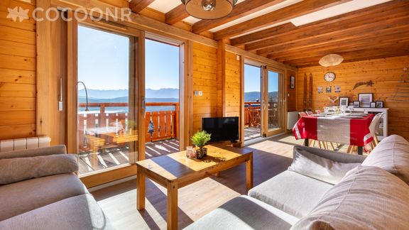 - Une pièce de vie de 35 m² avec canapé, TV, coin repas, avec vue sur la montagne et le lac