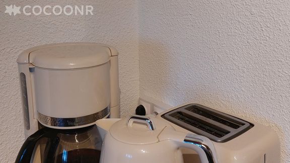 - Une cuisine équipée avec notamment : bouilloire électrique, cafetière à filtres, four, four à micro-ondes, grille-pain, lave-vaisselle, plaques de cuisson...