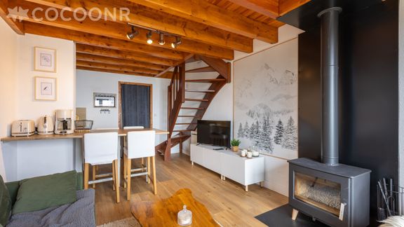 - Une pièce de vie de 22 m² avec canapé, TV, poêle à bois (première flambée offerte) et coin repas