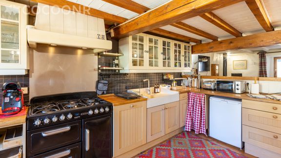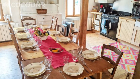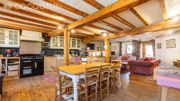 - Une salle à manger et cuisine équipée avec notamment : bouilloire électrique, un panier de cuisson à gaz avec four électrique, four à micro-ondes, grille-pain, lave-vaisselle, robot multifonctions, réfrigérateur, service à raclette et fondue...