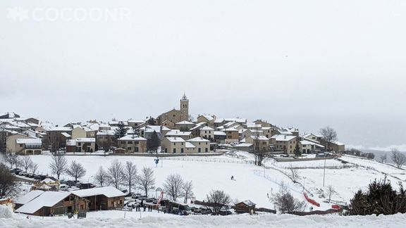 🙂 La casa está en el pueblo pero con vistas maravillosas. Está muy cerca de las pistas y es genial para familias, tiene de todo, muy bien equipada.