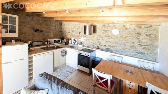 - Une cuisine équipée avec notamment : bouilloire électrique, four à micro-ondes, grille-pain, réfrigérateur avec petit congélateur, lave-vaisselle, lave-linge, cuisinière électrique avec plaques et four service à raclette et fondue, cafetière à dosettes Tassimo...