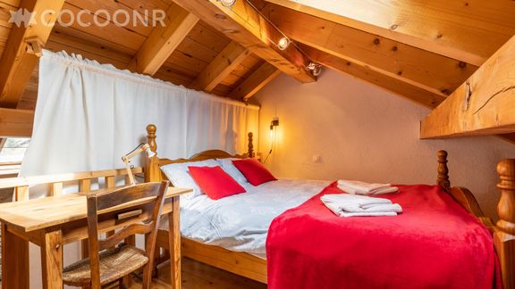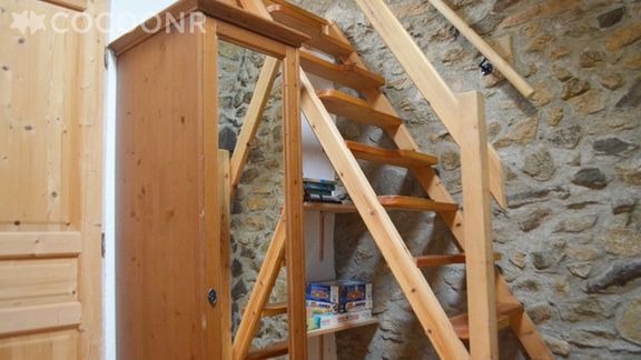 - Chambre 3 : en mezzanine, accessible depuis la chambre 2 par un escalier japonais, avec un lit double (140x190) et un bureau