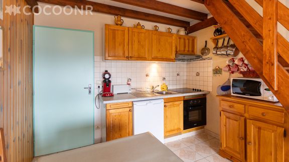 - Une cuisine ouverte équipée avec notamment : bouilloire électrique, four, four à micro-ondes, grille-pain, plaques de cuisson...