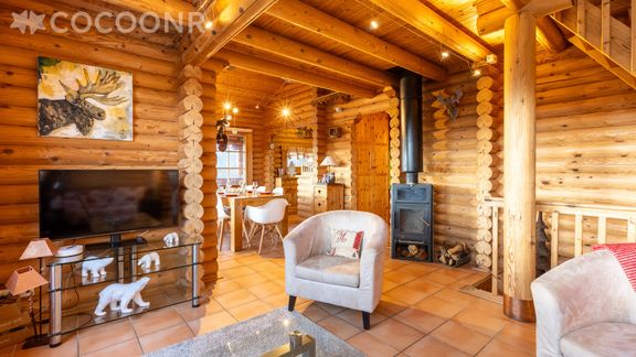 - Une pièce de vie de 60 m² avec canapé, TV, poêle à bois (bois fourni)