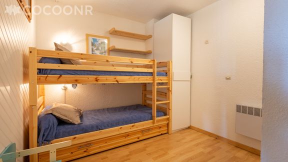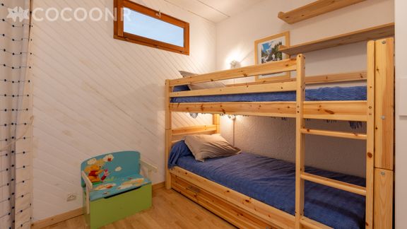 - Chambre 2 (séparation avec un rideau) : un lit superposé (deux lits simples)