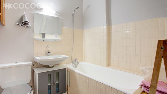 - Une salle de bain avec baignoire et WC