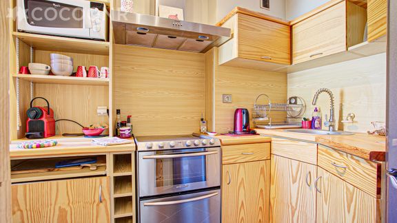 - Une cuisine équipée avec notamment : bouilloire électrique, four, four à micro-ondes, grille-pain, lave-vaisselle, plaques de cuisson...
