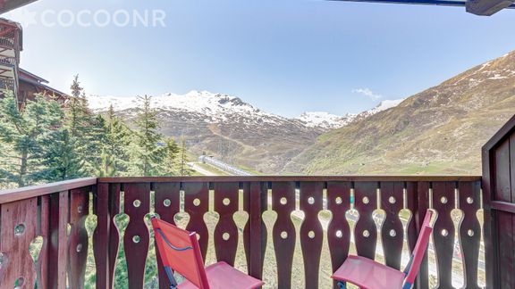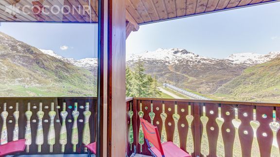 - Un balcon abrité d'environ 4 m², exposé sud-est doté de deux chaises et d'une vue imprenable sur les montagnes et le domaine skiable.
