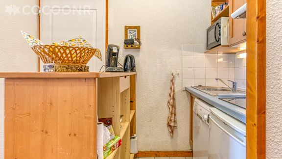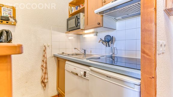 - Une kitchenette ouverte équipée avec notamment : bouilloire électrique, four à micro-ondes, grille-pain, lave-vaisselle, plaques de cuisson, cafetière à dosettes Senseo...
