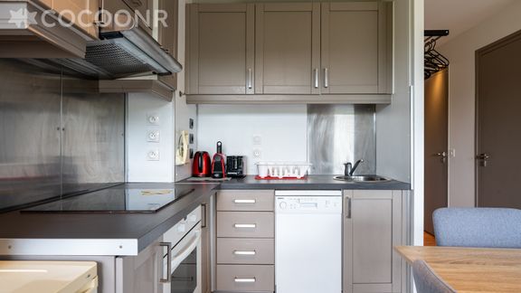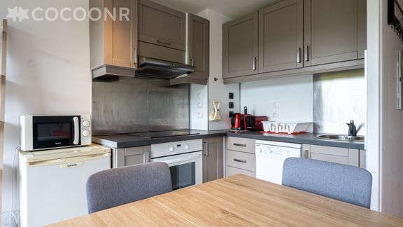 - Une cuisine équipée avec notamment : bouilloire électrique, four, four à micro-ondes, grille-pain, lave-vaisselle, plaques de cuisson...