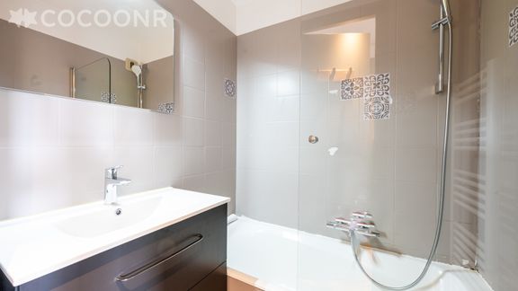 - Une salle de bain avec douche et baignoire